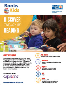 Parents may sign up their children for the program at any time; any child between 2 months and 4 years, 11 months can participate if they live within United Way’s service area of Blue Earth, Nicollet, Le Sueur, or Waseca counties, or if a parent works in Mankato/North Mankato.